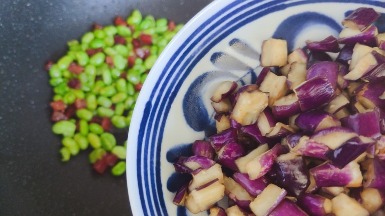 烧茄子是北方的家常菜,可是加上鲜毛豆后做出的菜就别有一番滋味了。毛豆、茄子两者相配做菜,比一般烧茄子色香味都要略胜一筹。