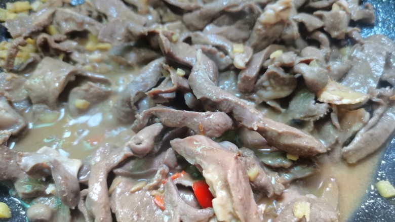 11. 配料煸香后,放猪心下锅翻炒