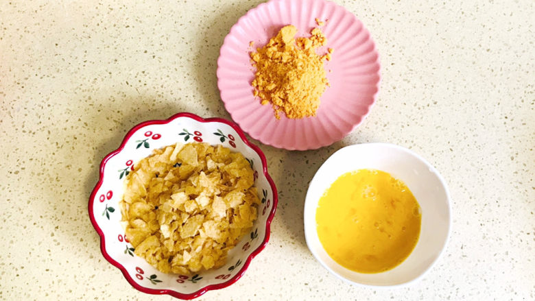 9. 将按压碎的薯片倒入碗里,准备好鸡蛋液,新奥尔良烤翅腌料倒进碟子里
