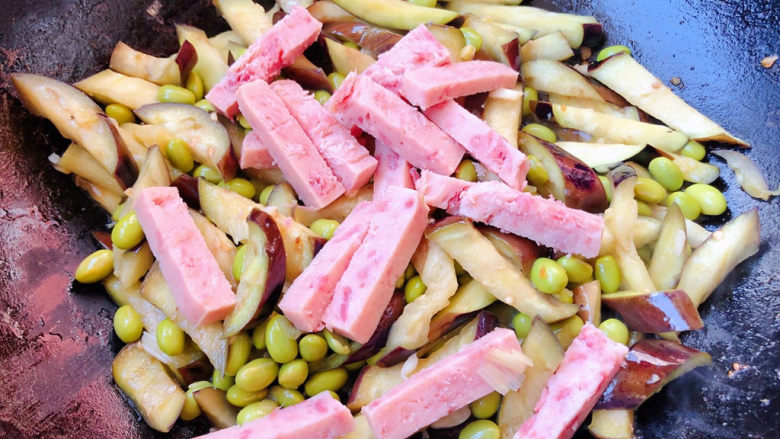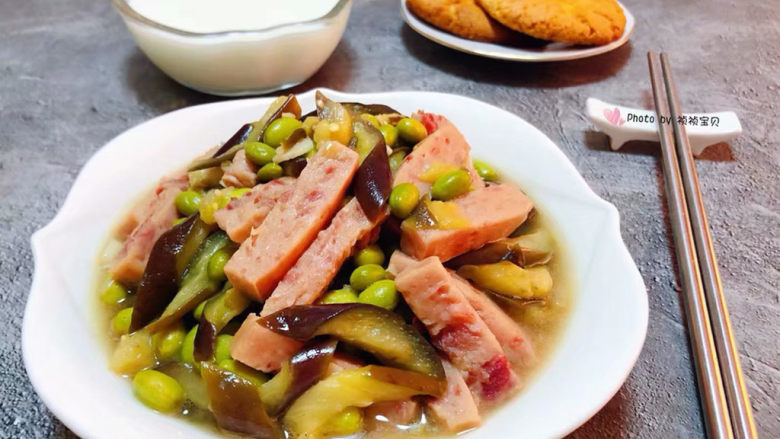 10. 营养丰富的毛豆烧茄子午餐肉装入盘中就大功告成了