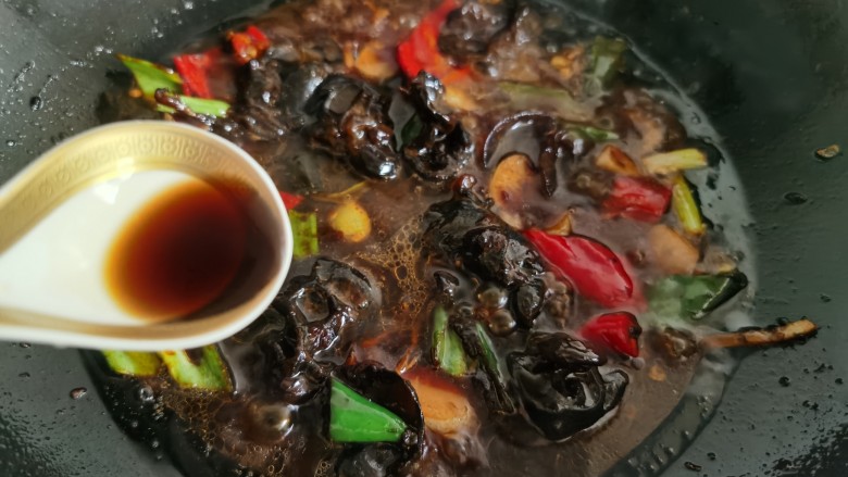 11. 放入青、红椒和木耳翻炒,然后加入甜面酱翻炒。