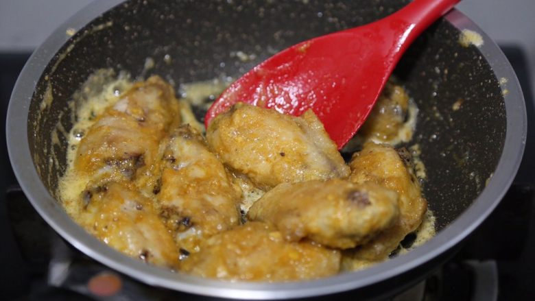17. 翻炒至鸡翅均匀的裹上咸蛋黄