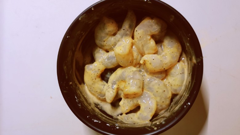 2. 虾仁挑出虾线,放入淀粉和胡椒粉。