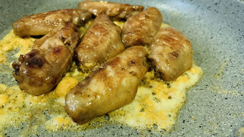 18. 加入煎好的鸡翅,让鸡翅均匀的粿上咸蛋黄,起锅,剩的咸蛋白,下锅炒一会,一同装碗里,不要浪费哦