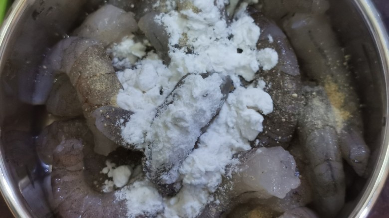 3. 放少许食油、胡椒粉、生粉,捞均匀。