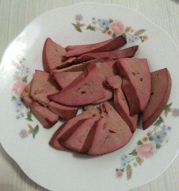 3. 这是熟的猪肝,有的人觉得生猪肝还得处理,嫌麻烦,那就直接买这种五香的熟的猪肝好了,粥里放这个猪肝有一点硬,生猪肝在粥里粥熟没有这么硬。
