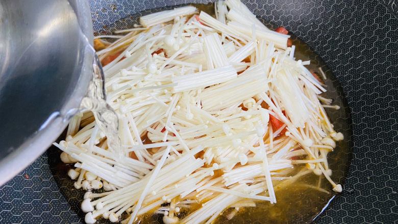 2. 金针菇洗净切掉根部再从中间切开,方便食用