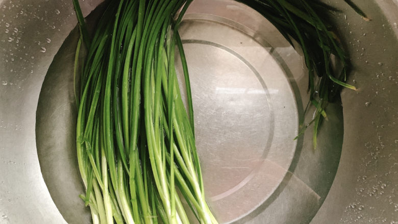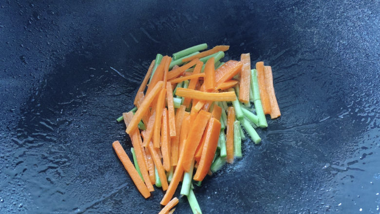 9. 大火入油,放入韭菜根部部分爆香,加胡萝卜翻炒。