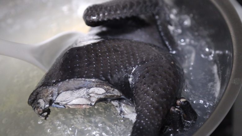 8. 将乌鸡冷水下锅,加入少许料酒煮开