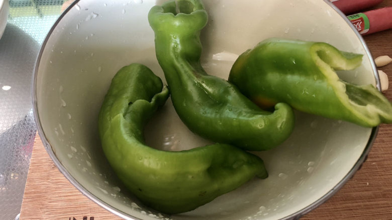4. 青椒去蒂去籽(怕辣的撕去筋),清洗备用