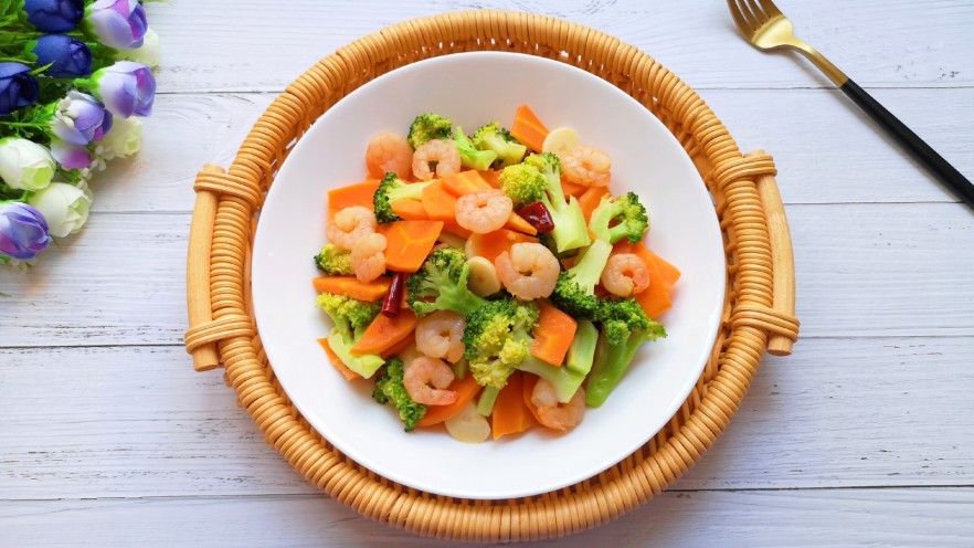 12. 下入西蓝花和胡萝卜翻炒均匀。