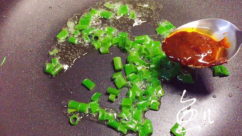 8. 另外用锅放油烧热,放入葱碎爆香,放入黄豆酱