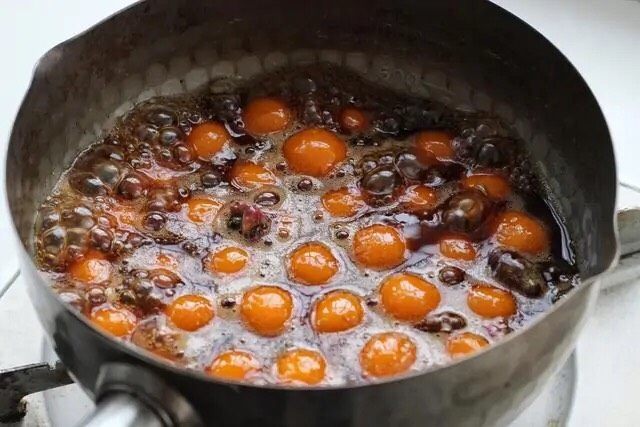 8. 用小火煮至红糖融化、汤汁成黏稠状态。