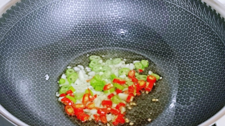 7. 起油锅,加入蒜末辣椒煸炒出香味。