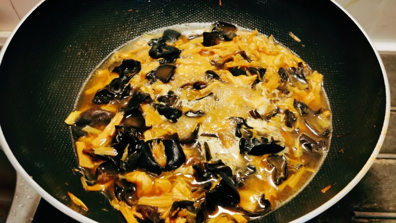 7. 放入木耳和黄花菜翻炒。