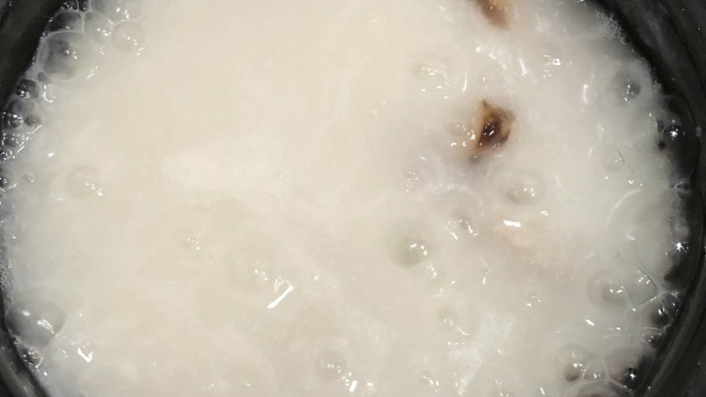 11. 粥先倒入香菇煮一会,差不多这个黏稠度就可以啦,煮了有20分钟,注意粥要一直看着和时不时的搅拌,如果粥泡太多了的话可以滴点花生油