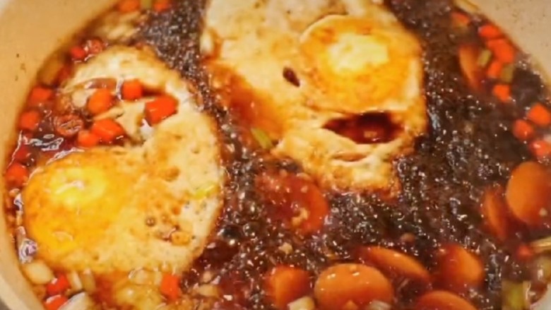 9. 然后倒入煎好的荷包蛋
