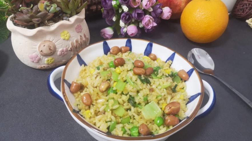 10. 加入甜玉米,甜青豆,青菜碎,盐适量,胡椒粉,几滴美极酱油翻炒均匀
