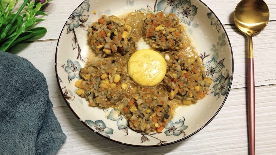 16. 出锅后中间的蛋黄加入少许生抽和油
