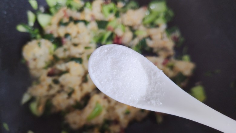 12. 然后不停翻炒,翻炒至米饭粒稍稍干燥,不再湿哒哒的