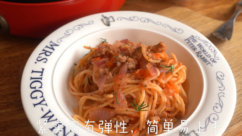 用新鲜番茄和肉酱制作小朋友们爱吃的意面,做法很简单,意面裹着满满的酱汁,香气十足,让小朋友胃口大开,停不下来。