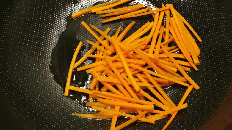 7. 起油锅,放入一汤匙食用油,油热后放入胡萝卜翻炒。