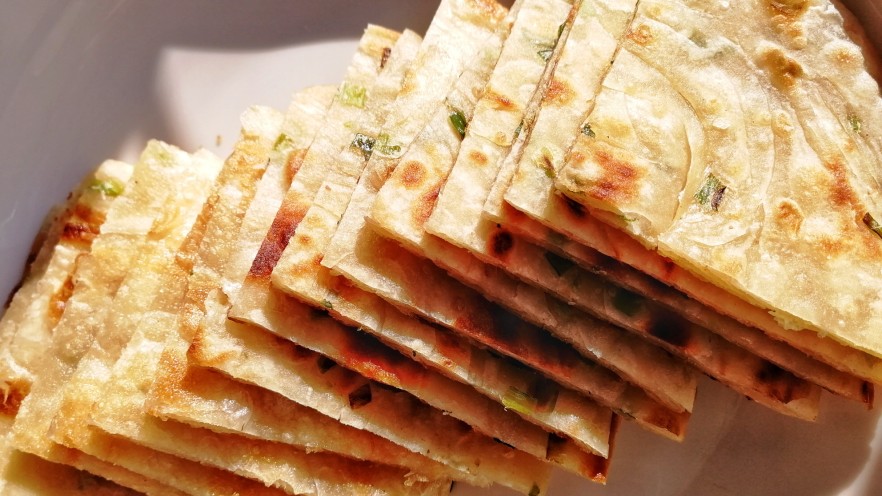 16. 中小火烙至两面金黄,饼起鼓即可。