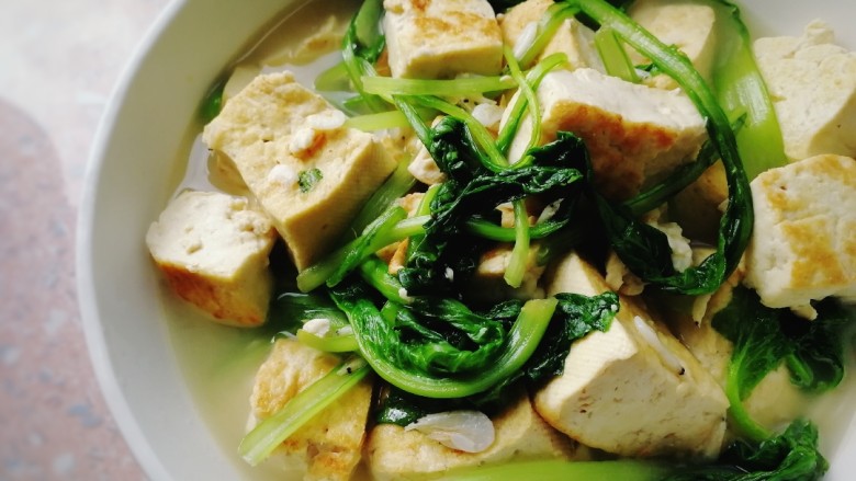 豆腐含丰富的植物蛋白,有生津润燥的功效。小白菜清肺止咳,养阴生津,解毒。小白菜炖豆腐:清爽可口、清肺祛火,健脾开胃。