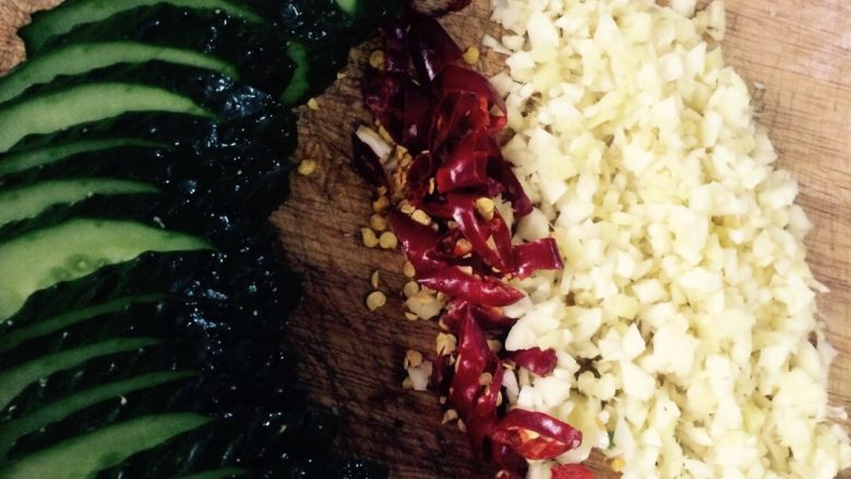 4. 黄瓜切片,干辣椒切碎,、蒜切成小粒。
