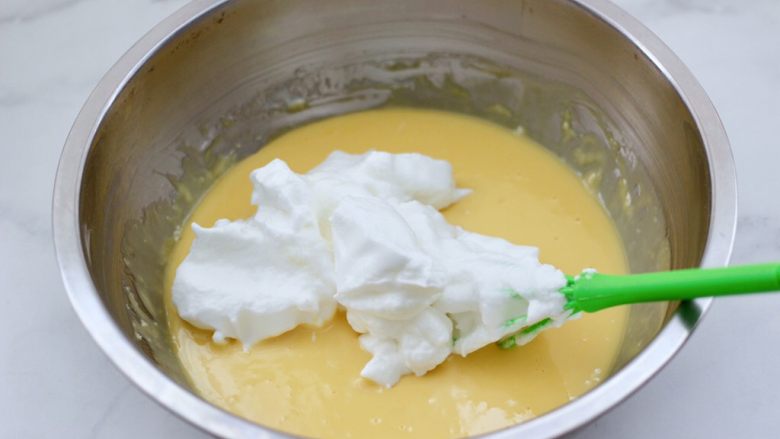 8. 先取三分之一蛋白糊,加入到蛋黄糊里翻拌均匀。