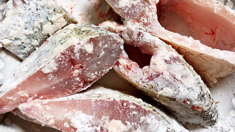 7. 腌制好的鱼块将汤汁倒掉,撒上一层淀粉,抹匀。