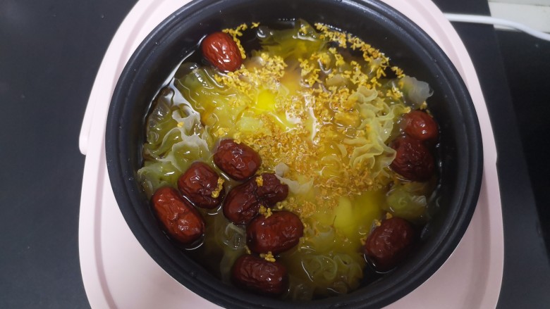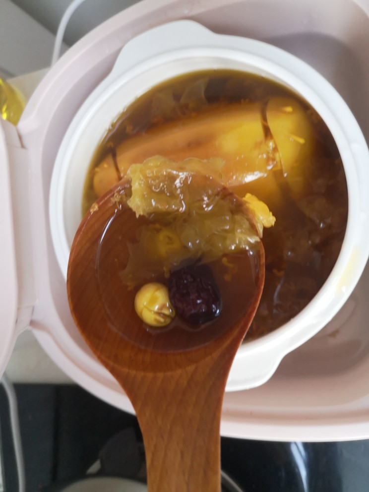 39. 煲好的糖藕可以两吃哦: 第一种吃里面的银耳红枣莲子汤作甜品,汤汁金黄色,因有银耳一起胶质丰富营养