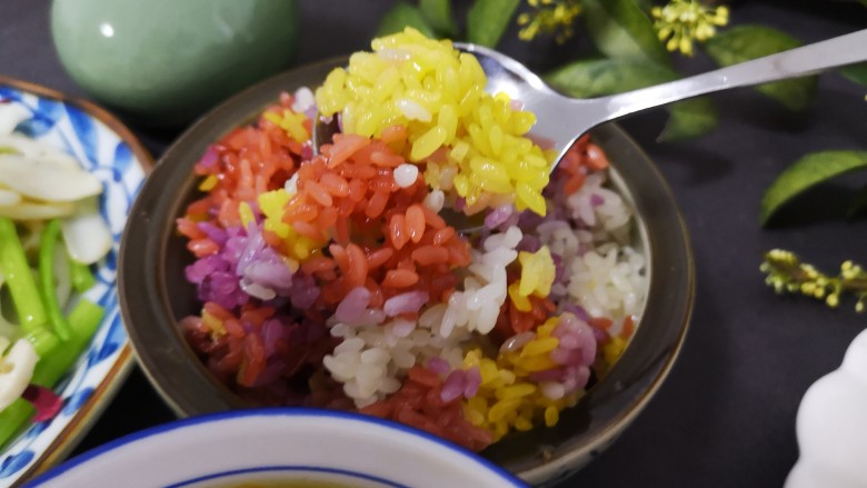 43. 煮的彩色糯米颜色会因浸煮好没有煮前或蒸熟的米饭亮丽,颜色属粉粉的也一样漂亮,不同烹饪出不同色彩变化