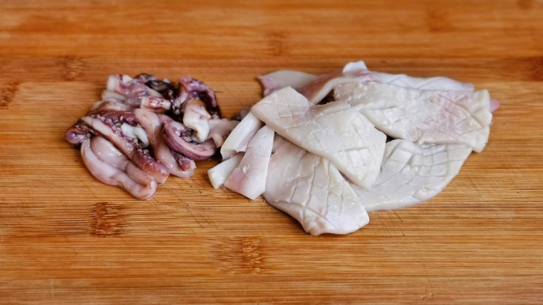 4. 焯水:锅中水烧开后下鱿鱼,大火45秒捞出,淋干水分。