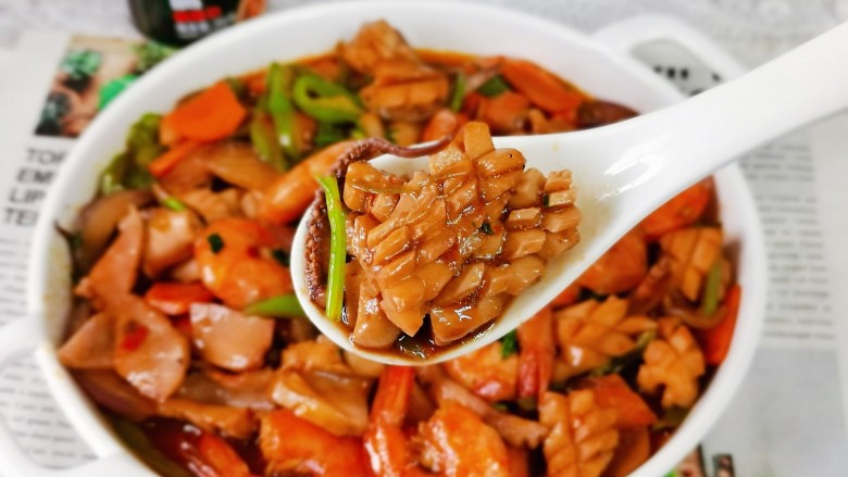 - 这款麻婆豆腐调味料一罐70克,可以根据个人口味增减量,总之可多可少,适合自己的口味就可以。 焯水后的鱿鱼无需煸炒太久,不然口感会老,这道菜还可以加入自己喜欢的配菜,比如藕片,土豆片等等都可以,口感比麻辣香锅还赞。