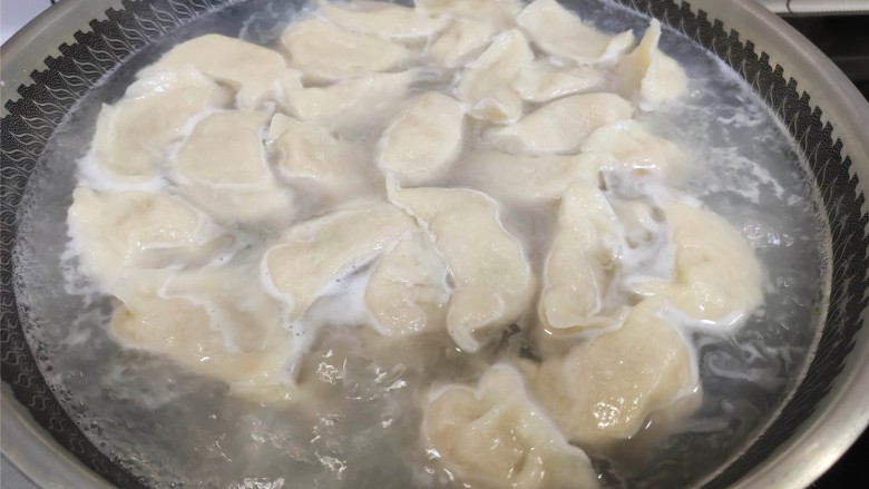 12. 饺子全部放入锅中以后把锅盖盖上,沸腾以后再加三次清水,每次加半碗,最后一次沸腾,饺子漂上来,而且皮鼓起来说明饺子就熟了。