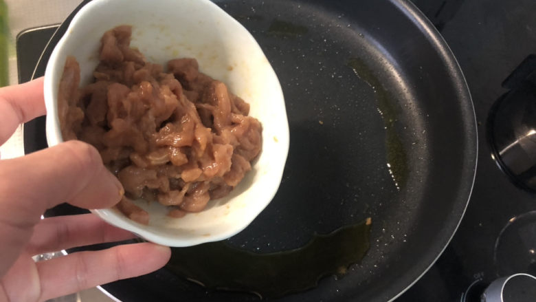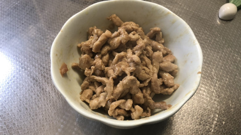 9. 加入一汤匙水淀粉,抓拌均匀,让肉丝吸收水淀粉
