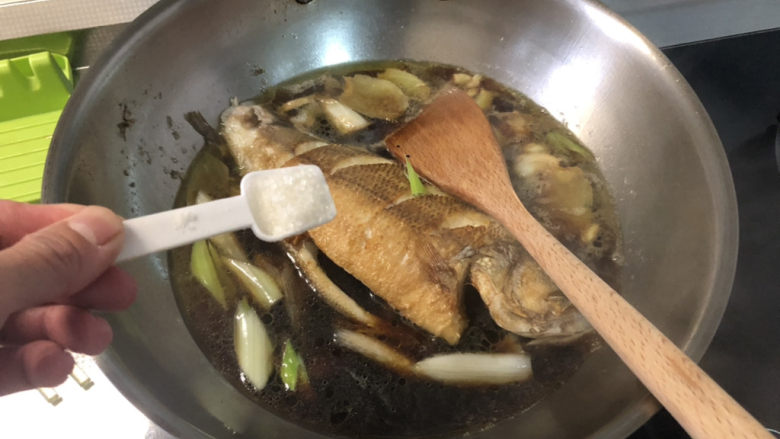 20. 尝下咸淡,根据自己口味补充适量食盐,注意烧鱼调味要咸一点,咸鱼淡肉,味道更好