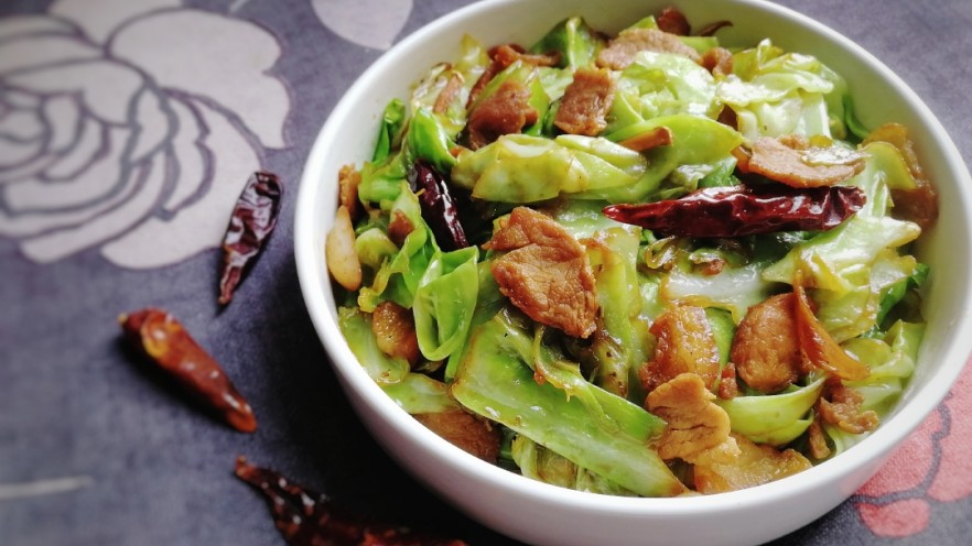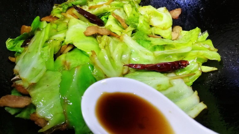 12. 急火翻炒均匀,热油包裹上包菜就不会出水。