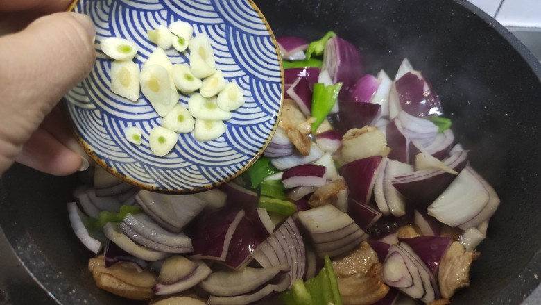 10. 加入蒜片翻炒均匀。