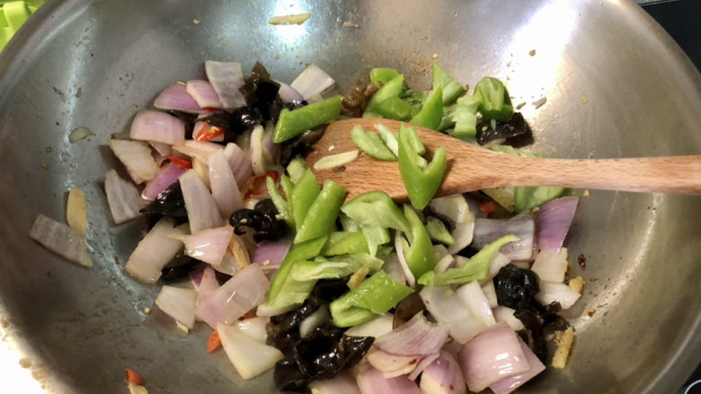 21. 底油,下姜丝蒜片小米辣,煸炒出香味