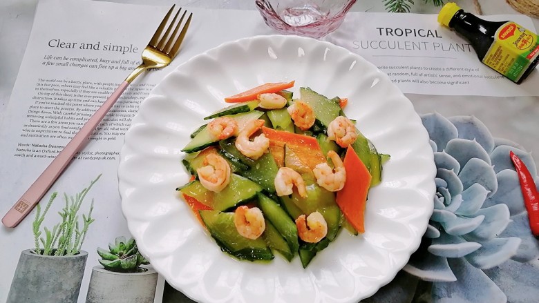 17. 拍上成品图,一道美味又营养的黄瓜炒虾仁就完成了。