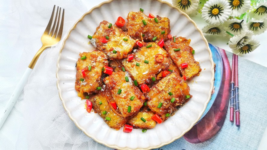 9. 锅里入油,放入带鱼小火煎至两面金黄酥脆盛出。