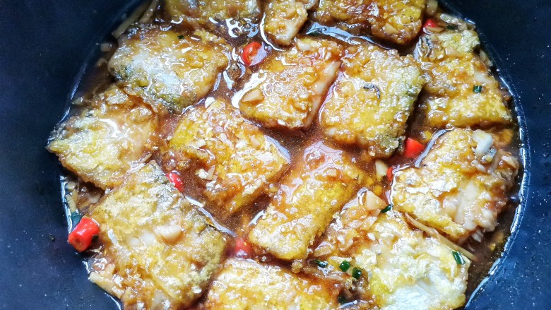 13. 放入带鱼,带盖子焖煮5分钟,