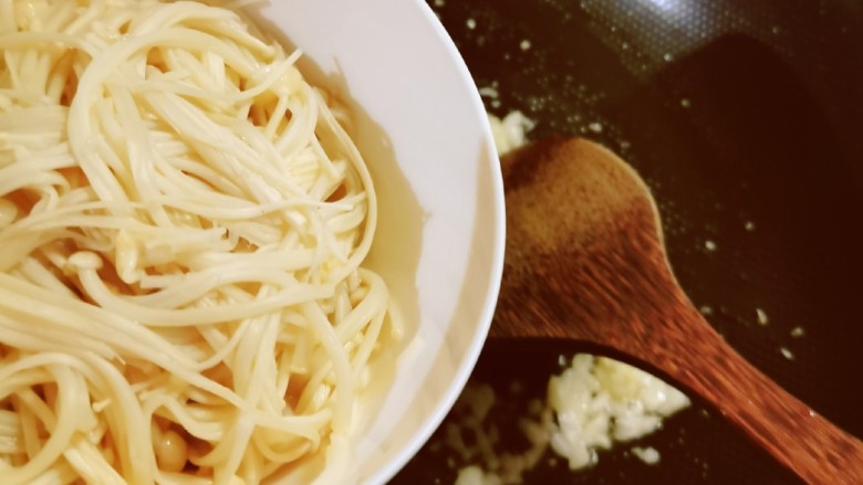 7. 起油锅放入食用油,油热后放入蒜碎炒香。