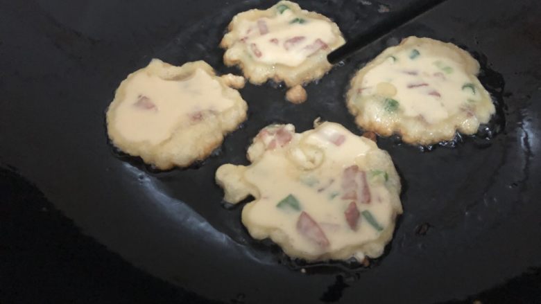14. 油热,转小火用汤勺舀半勺慢慢下锅(喜欢大点的就舀多点)
