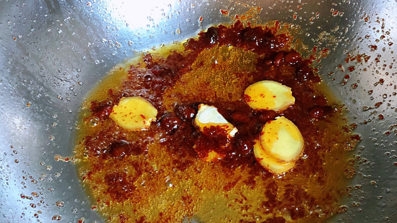 3. 油热后,黄豆酱炒出红油