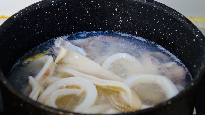 7. 提前烧一锅热水,水中放入姜片,待水开后放入处理好的鱿鱼焯水,时间约1分钟左右。