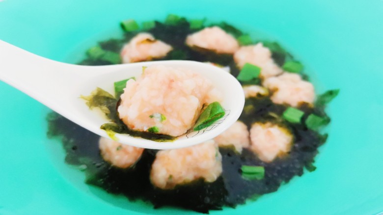 14. 滑入虾球,烧开浮起,放入盐,料酒,生抽,放入紫菜,散上葱花,淋上几滴香油
