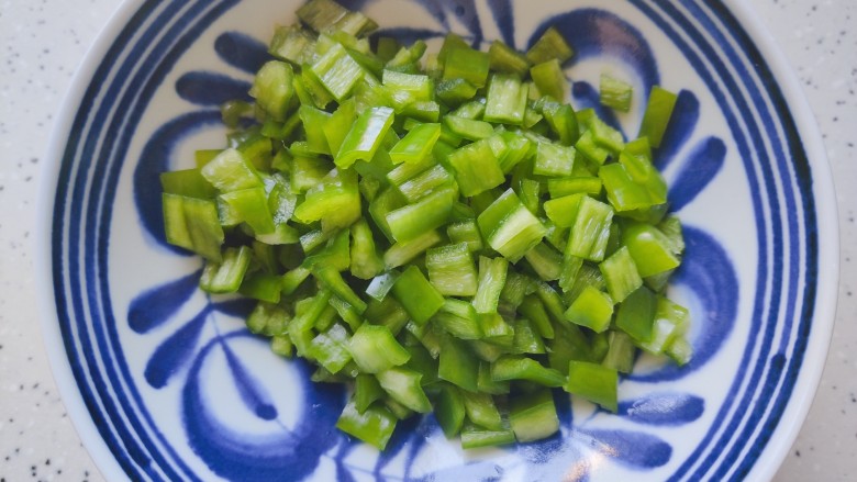 4. 青椒去蒂去籽,洗净之后切成小丁